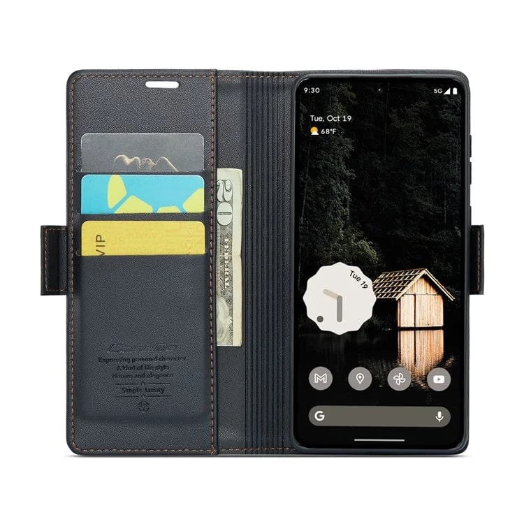 Enhance your Google Pixel with this RFID-blocking wallet case, offering premium leather craftsmanship, convenient storage, and advanced security features to protect your cards and personal data.