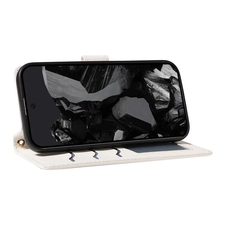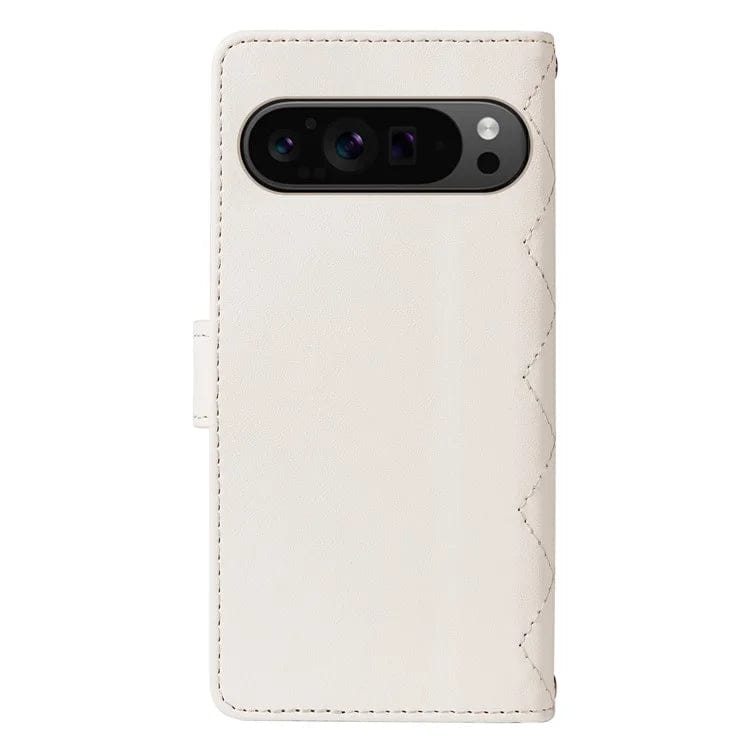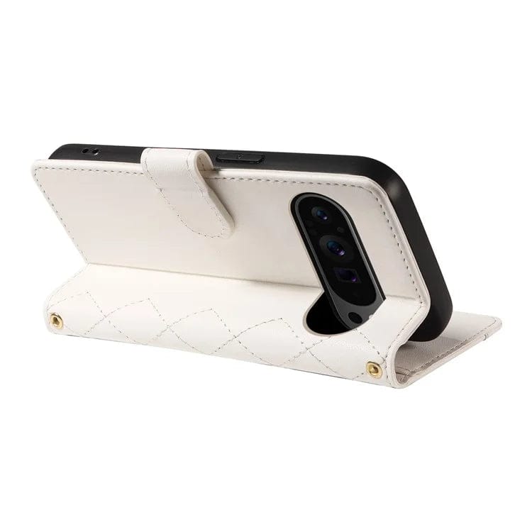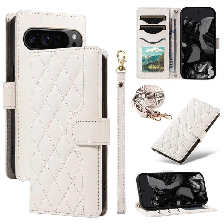 Upgrade your Google Pixel with this luxurious and functional wallet case featuring a stylish rhombus leather design and detachable straps for versatile carrying options.